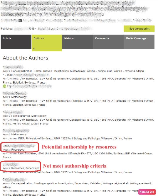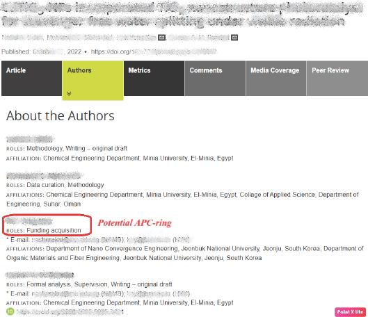Below are screenshots (taken from two randomly selected articles) illustrating two scenarios that do not adhere to the authorship criteria of PLOS ONE. In the first case, one of the authors falls under the category of “Potential APC Ring,” while in the second case, two authors do not meet the authorship criteria, with each falling into different categories: “Potential Authorship by Resources” and “Does not meet PLOS ONE authorship criteria”.