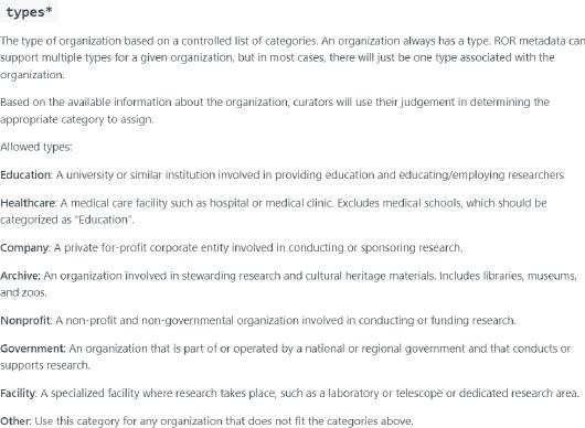 Description of affiliation types presented in Table 5. Source: https://ror.readme.io/docs/ror-data-structure