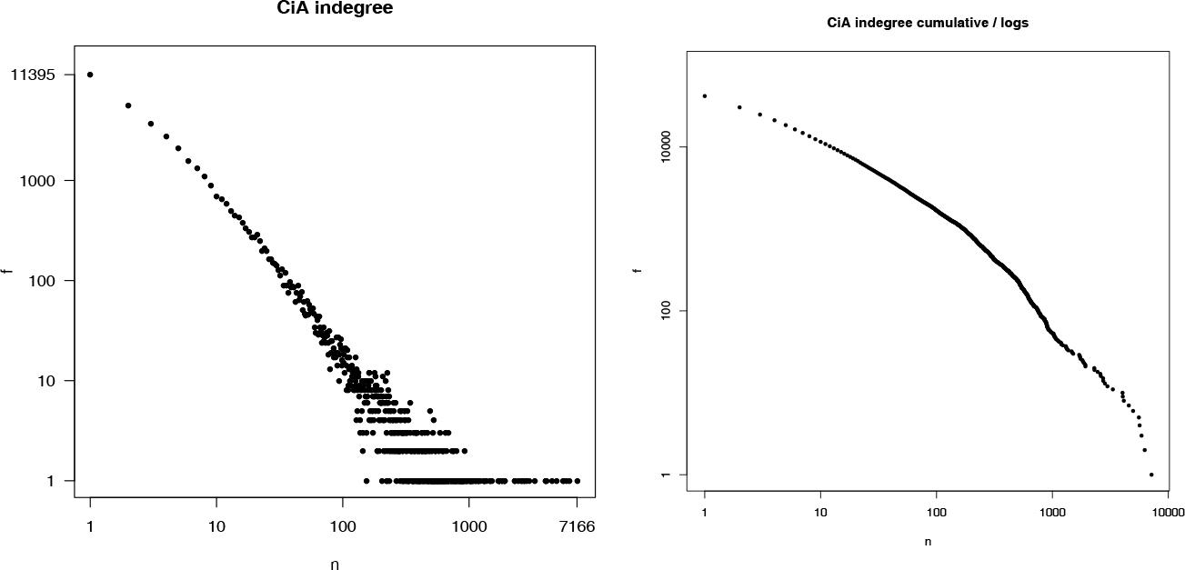 CiA: Indegree (number of citing works) distribution in double-logarithmic scale-frequency (left), and complementary cumulative (right).