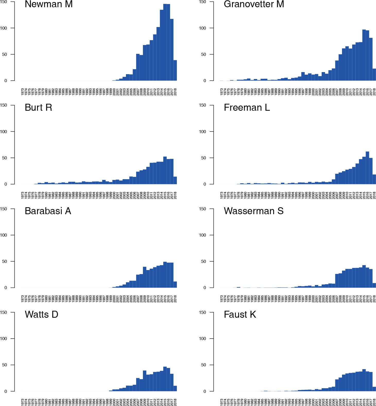 For the selected top eight authors from Table 1, we traced three similar measures, showing the temporal distributions of the numbers of citations from authors: indegree and weighted indegree of TACiA, and weighted indegree of TACiA″ networks. The distributions show citation trends similar to those observed above (Figure 4), which is why we left the temporal distributions only for Newman and Granovetter in Figure 6. The difference between the incoming regular and weighted degrees is relatively large, which means that many authors tend to cite other authors in many works. The fast growth from 2007 in most of the presented diagrams can be observed, which can be due to the significant attention that networks and network analysis received. Another explanation could be the inclusion of additional journals in WoS.