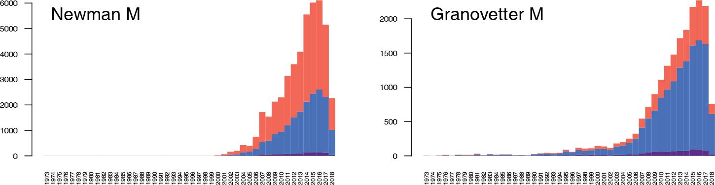 The initial dataset was formed from the publications matching the query “social network*”, and thus some works related to the broader field of network analysis could have been overlooked. The search query for “network analysis” would be too broad, including the works on computer networks, optimization problems for networks, etc. We used an iterated saturation search of papers that were intensively cited in the initial dataset but did not have full descriptions as the main approach to discover important papers overlooked by the initial query. We searched for the works with high (at least 150) citation frequencies using WoS. If a description of a work was not available in WoS, we constructed a corresponding description without CR data and searched for the work using Google Scholar. We also extended the results of the original query with papers published by the most prominent authors (around 100 scholars) and works from flagship SNA journals indexed in WoS (such as Social Networks, Network Science, Social Network Analysis and Mining, and Journal of Complex Networks). Other network-related journals, such as Computational Social Networks, Applied Network Science, Online Social Networks and Media, Journal of Social Structure, and Connections, were considered, but were not abstracted in the WoS. The used strategy resulted in the dataset, which covers not only the works of social scientists, but also influential papers published by physicists, biologists, information and computer scientists, etc. Previous analyses on this dataset (Maltseva & Batagelj, 2019; 2020; 2021; 2022) show that the strategy we used was appropriate to extract expected sample data, and this approach produces a good coverage of the field’s important publications. We should note that other strategies of data collection could be used, such as using other relevant keywords extracted from SNA journals and controlled vocabularies; this information can now be taken from the results of this project. To be consistent with our other studies, we had to stick to working on the dataset collected up to 2018.