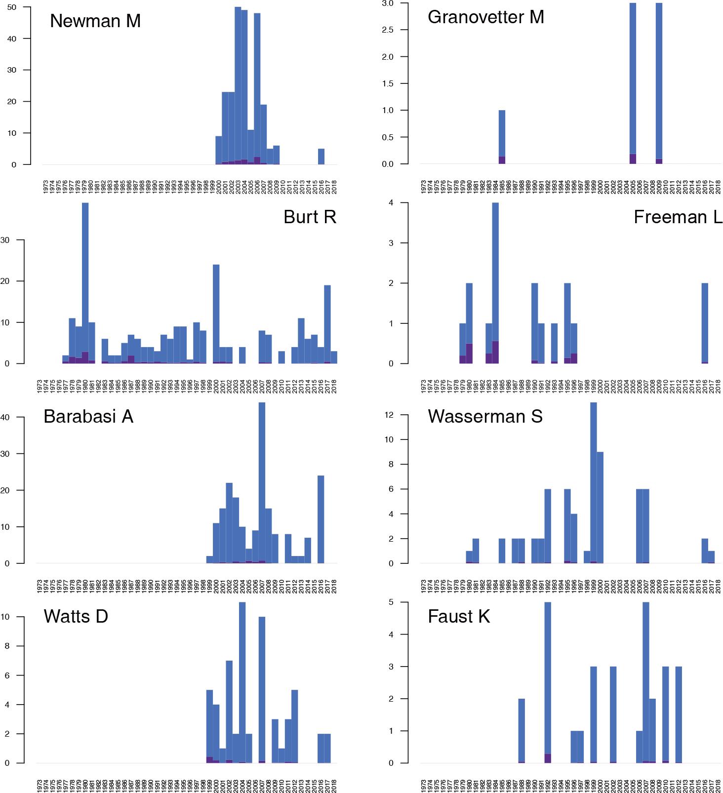 For these authors, we examined the temporal distributions of the number of citations from works: indegree and weighted indegree of TCiA, and weighted indegree of TCiA″networks. These are presented in Figures 4 and 5, respectively. These distributions show that while some authors collect their incoming citations from works through the whole periods of their professional lifes (sociologists Burt, Granovetter, Freeman, Wasserman, Faust), other managed to obtain the maximum values of citations through relatively short periods of time (physicists Newman, Barabási, Watts). For some authors, such as Newman, Burt, and Barabási, the difference between the incoming regular and weighted degrees is relatively large, which shows that their names appear several times in the same reference lists of the citing works.