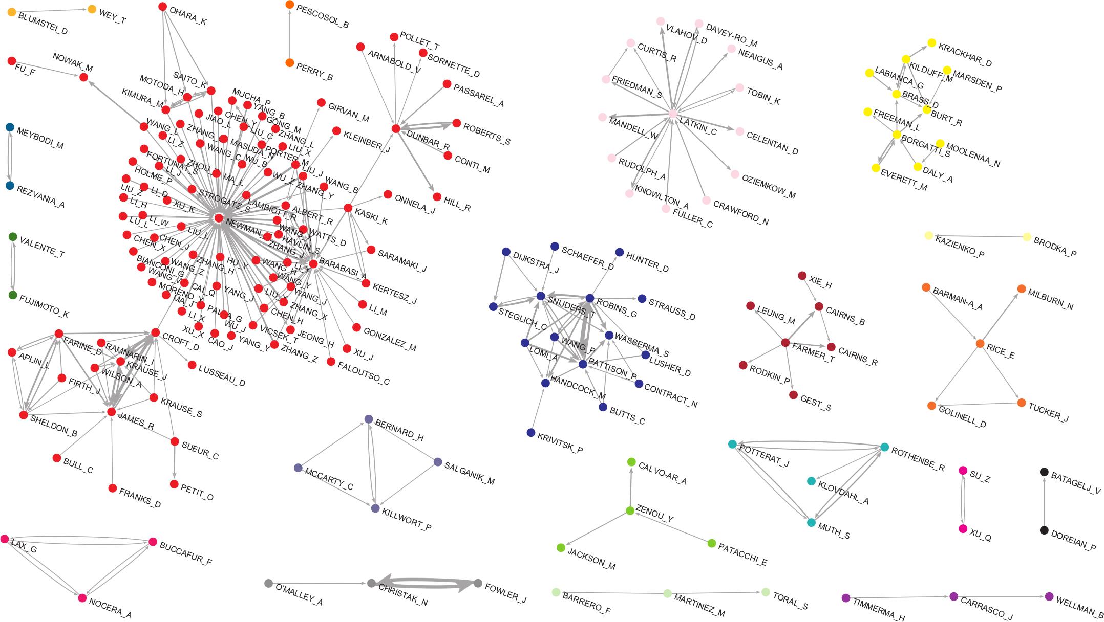 In Figure 12, the largest island on the left comes from the physics literature and is centered on Newman. Most of the authors in this island have Chinese and Korean names, but it also includes well-known physicists mentioned in the previous analysis of citation networks: Barabási, Albert, Watts, and Strogatz. The second and third islands are formed by the groups of classical social network scientists.