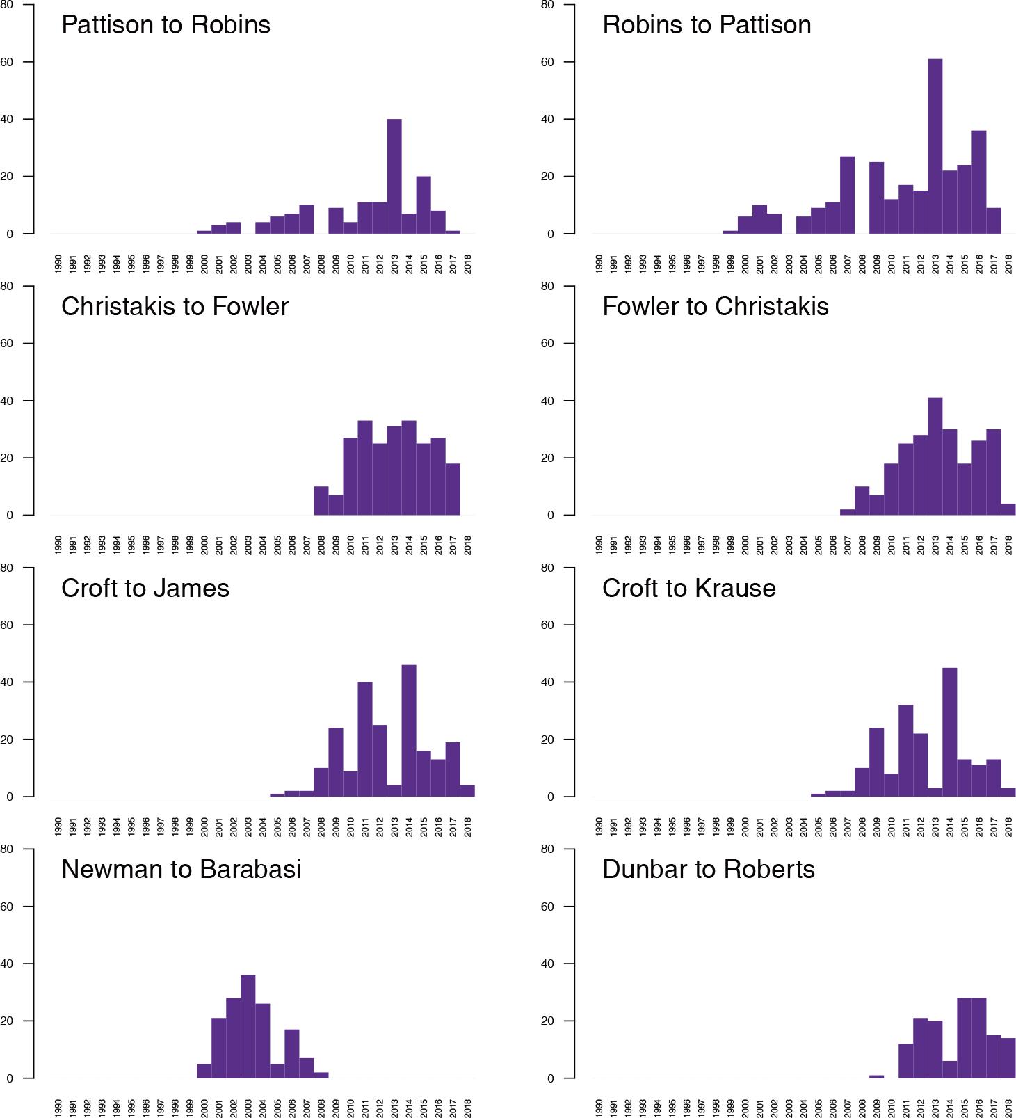 Using the threshold of 140 citations from the network ACiA, we extracted the most related pairs of authors. These are the following pairs, with the number of citations given in brackets: Robins to Pattison (298), Fowler to Christakis (240), Christakis to Fowler (237), Croft to James (215), Croft to Krause (189), Newman to Barabási (147), Pattison to Robins (146), and Dunbar to Roberts (145). Using the network TACiA, we traced the temporal distributions of the citations between these pairs (Figure 9). The high number of citations is received through time, showing the appreciation of works for the selected authors.
