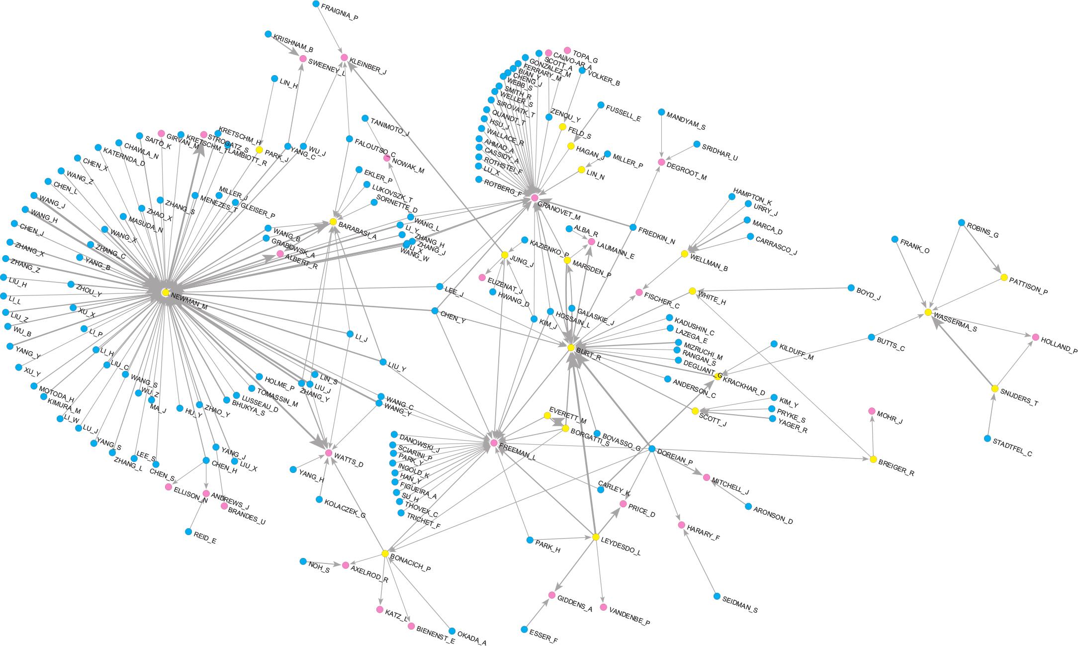 The main island of 200 nodes is presented in Figure 10. As the nodes form chains of citations from one author to the second, and then to the third, in the figure, blue represents the initial, only citing, node; yellow represents the intermediate, cited and citing, node; and pink represents the terminal, cited only, node. We can observe several different groups of authors in this subnetwork, interconnected to each other. The largest part of the subnetwork is represented by physicists centered around Newman (mostly), Barabási and Watts (to a lesser degree). Again, there are many authors with Chinese and Korean names in this part of the subnetwork, appearing only in a citing role. Brandes, a representative of the social/computer science part of network analysis, appears in this part of the subnetwork, being largely cited by J. Yang. The right part of the island is formed by several groups of authors from the social sciences. Some of them are centered around Granovetter, Freeman, and Burt, having many incoming citations; smaller groups are formed around Wellman and Scott. Other groups arise around the well-known authors who cite and are cited: Doreian, Leydesdorff, and Wasserman (with the group similar to the one observed in the results of ACiA network analysis above). This part of the island also includes other well-known researchers in SNA: White, Marsden, Everett, Borgatti, Carley, Breiger, et al. Between the two parts, we can observe intermediate nodes that cite the authors from the social sciences and network science groups. Their position implies only the usage of the two fields, but not the transfer of knowledge between them. Moreover, these are the authors Chinese and Korean names. However, we can notice the special position of Watts, who is cited by Bonacich (SNA) and Newman (NS) and can be classified as an author connecting two fields: physicist and sociologist.