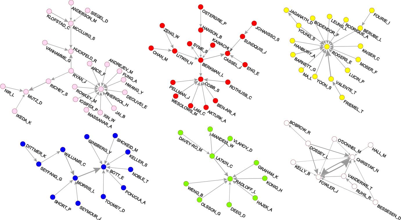 Among the other 36 islands of sizes 10–43 nodes, many are not very interesting in terms of structure: they are star-like or (almost) complete clusters. To describe the majority of authors, a search for additional information is needed. Without having the time and space to drill into all the obtained islands, we decided to discuss only those with well-known names. Figure 11 shows several such islands with interesting structures, representing the authors from SNA or SNA-related areas. One of the islands includes one of the founding mothers of SNA, Bott, working on issues of family and social networks, starting from the 1950s. Another island is centered on Rogers, with Valente as one of the citing authors, developing the topic of the diffusion of innovations. Another island is partly centered on Rheingold (virtual communities), and in another part includes the authors from political science working on social media analysis. Other groups include Latkin and Radloff, Berkman and Litwin, and Christakis and Fowler – the authors working in epidemiological and health studies. Among the islands with star-like structures, we identified well-known authors with many incoming citations. Interestingly, some belong to the field of SNA, such as Dunbar (social and evolutionary neuroscience) and Portes (social capital). Other largely cited authors are quite distant from the field of SNA, though they provide an important conceptual and theoretical basis for the field: Wenger (communities of practice) and Prensky (digital natives and immigrants), Castells(theory of information and network society), Latour (actor-network theory, ANT), and Goffman (sociological theorizing of social interaction).