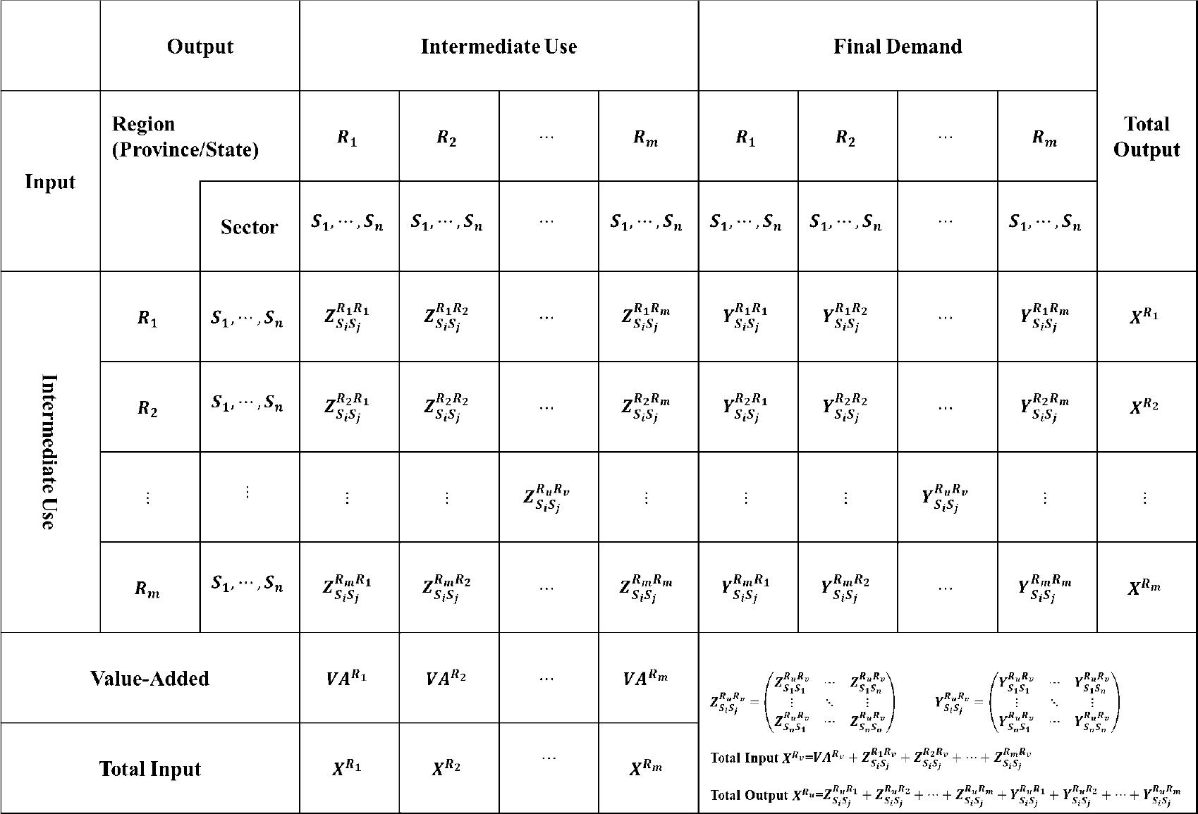 Suppose an IRIO table includes m regions (u,v=1,2,…,m) and each region includes n departments (i,j=1,2,…,n), as shown in Table 4: Suppose an IRIO table includes m regions (u,v=1,2,…,m) and each region includes n sectors (i,j=1,2,…,n) as shown in Table 1.