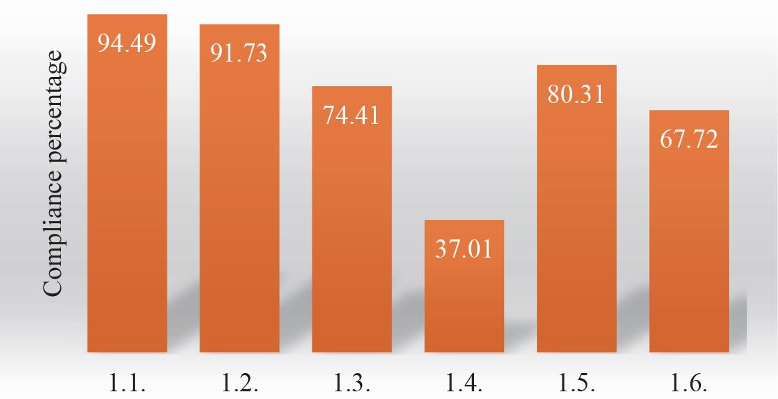 Looking at compliance percentages for each indicator, Figure 1 shows that transparency indicators generally present better compliance rates, especially indicator 1.1 (specify the licences under which contents are published) and indicator 1.2 (make intellectual property right ownership clear to the author(s)); these two policies seem to be active practices in over 90% of the journals. Indicator 1.4 (post the editorial policy on Sherpa Romeo) is, on the other hand, the indicator with the worst compliance rate (37% of the journals).