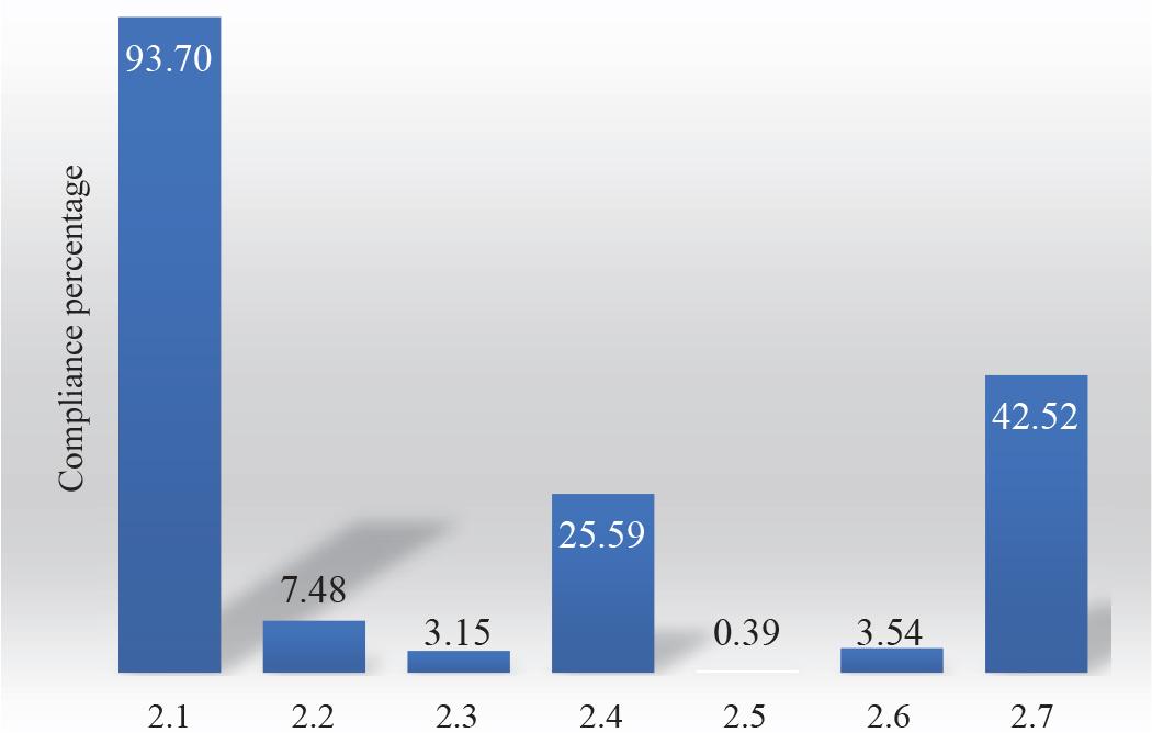 The most widespread openness indicator is indicator 2.1 (publish open access contents), with a compliance rate of nearly 94%. However, other indicators, like 2.2 (encourage authors to deposit supplementary materials), 2.3 (associate articles with their supplementary materials), 2.5 (allow open peer review) and 2.6 (have a metadata transfer protocol) display a very low application rate amongst Spanish journals, especially the open peer review indicator, which is applied at 0.38% of journals (Figure 2).