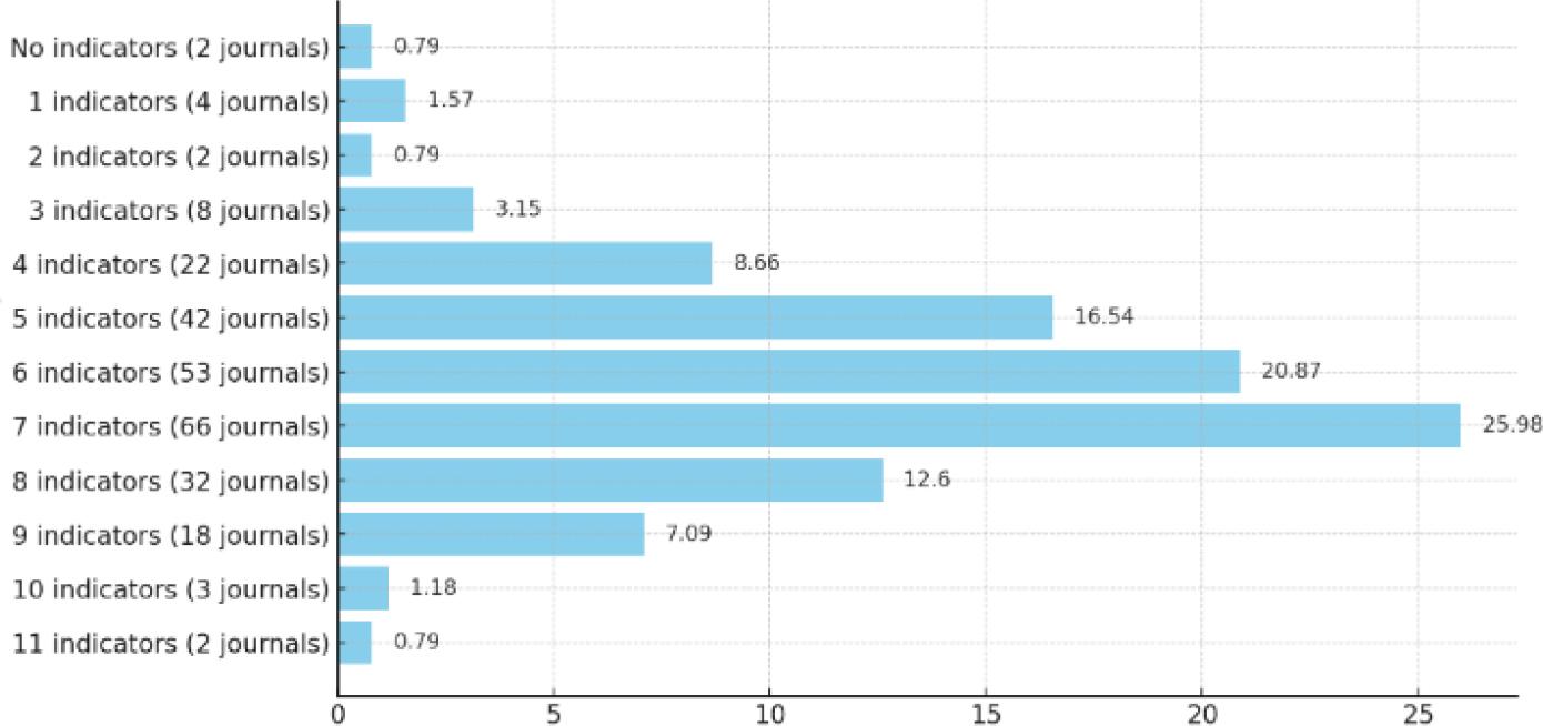 Figure 3 shows that half the journals (47.64%) satisfy seven or more indicators, and under 15% of the journals satisfy fewer than five indicators. Overall, these are positive results.