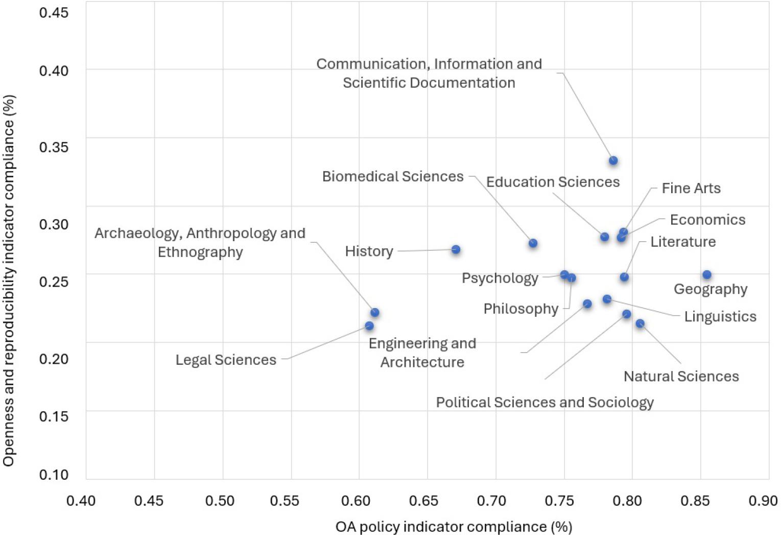 The strong focus on open access transparency likely reflects compliance with national legislation, such as Article 37 of the 2011 Spanish Science Act. In contrast, the limited uptake of openness and reproducibility indicators may be attributed to their more recent inclusion in legal frameworks.