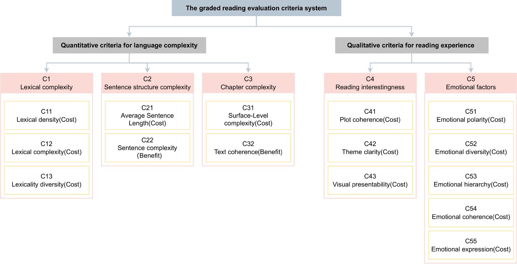 Graded reading is an instructional approach that provides learners with reading materials tailored to their current proficiency levels. Through intervention, we gradually increased the reading difficulty of the materials to improve learners’ comprehension and language skills (Nation, 2009). The selection of graded reading materials is determined on the basis of established standards and expert evaluations to ensure appropriate difficulty and content suitability (Hiebert & Mesmer, 2013). This method is significant because it helps learners progress step by step, builds reading confidence, and fosters sustained interest in reading (Waring & Takaki, 2003). However, when faced with a large amount of in-class and out-of-class reading material, there is a lack of effective and mature methods for determining whether a book is suitable for students. Rough evaluations based on teacher experience or simple text-difficulty metrics are both biased and difficult to guarantee scientifically consistent results, often leading to disagreements. Therefore, a scientific and comprehensive evaluation of reading materials is an urgent problem that needs to be solved.