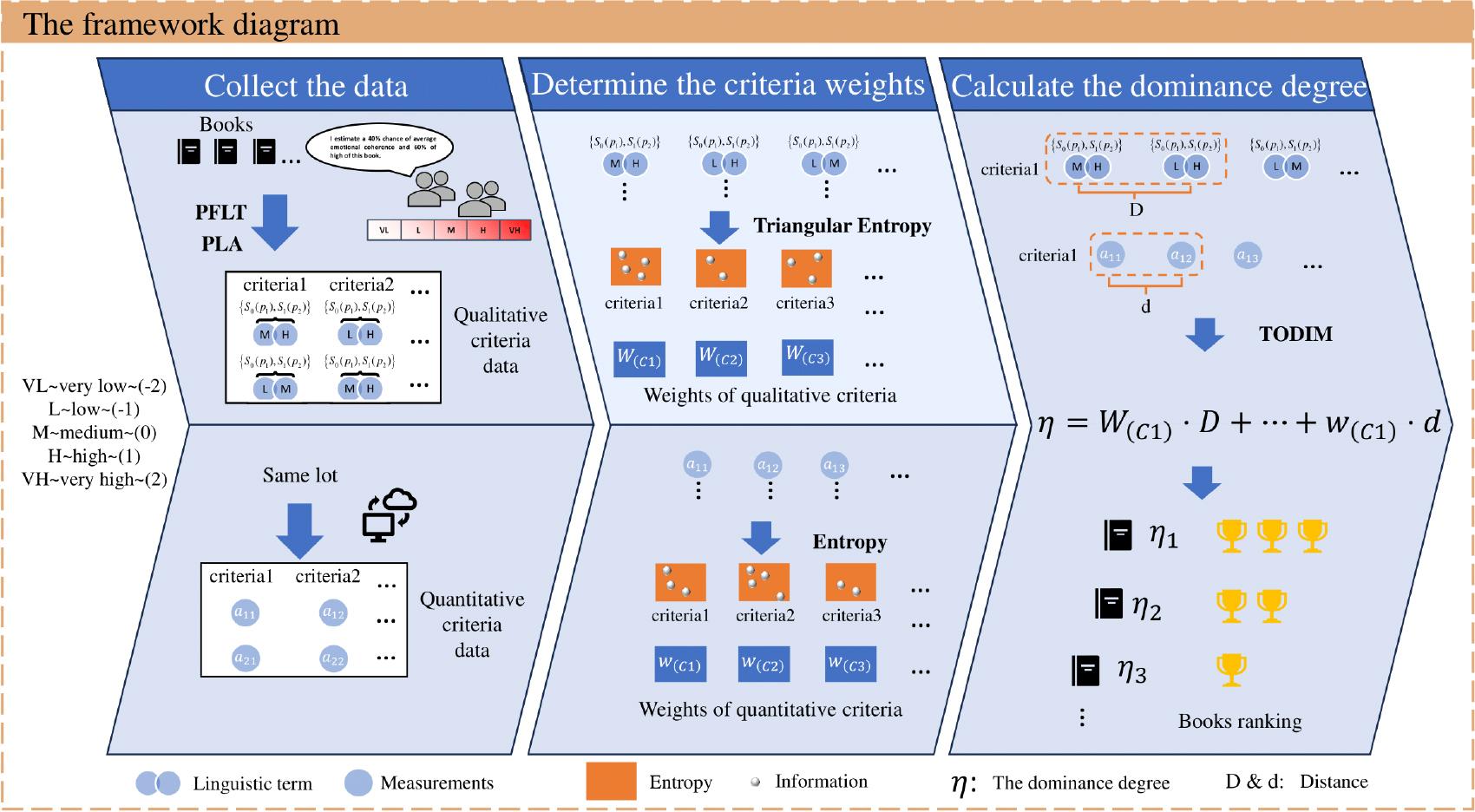 The evaluation framework diagram. The process involves three steps from left to right: collect data, determine criterion weights, and calculate advantage degrees. Firstly, data is collected and aggregated using Probabilistic Fuzzy Linguistic Term (PFLT) and Probabilistic Linguistic Averaging (PLA). Qualitative data is assessed by experts using linguistic terms at five levels: Very Low (VL), Low (L), Medium (M), High (H), and Very High (VH), while quantitative data is directly measured values. Next, triangular and traditional entropy methods are used to calculate weights for the two criteria. Finally, the TODIM method calculates the advantage degree of each book based on the criterion and combines degree to rank the books.