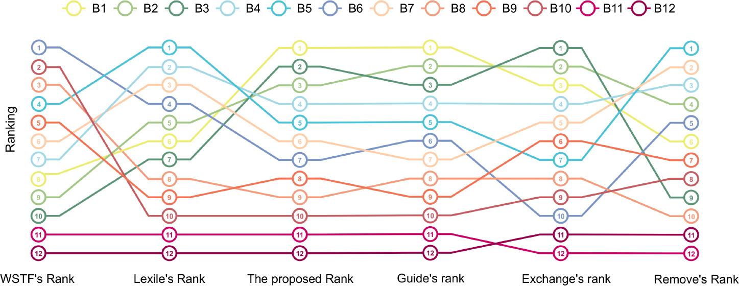The internal comparison examined the effect of incorporating reading experience into the ranking process and the influence of using expert versus student evaluations. First, we calculated text difficulty (vocabulary, syntax, and structure) for the 12 books using the Weighted Sum Technique for Fuzzy Ranking (WSTF’s Rank) readability formula (Paul et al., 2021) and the Lexile assessment tool, producing a baseline ranking. Next, we generate a second ranking by excluding expert evaluations, denoted as the “Remove” ranking. Finally, we replaced expert evaluations with assessments from 50 students at the Shanghai University of Science and Technology’s affiliated primary and secondary schools, resulting in the “Exchange” ranking based on student input on the qualitative criteria for each book. Figure 3 displays these rankings, while Figure 4 illustrates the correlation between them and the authoritative “Guide” ranking, using Kendall’s tau to measure consistency.