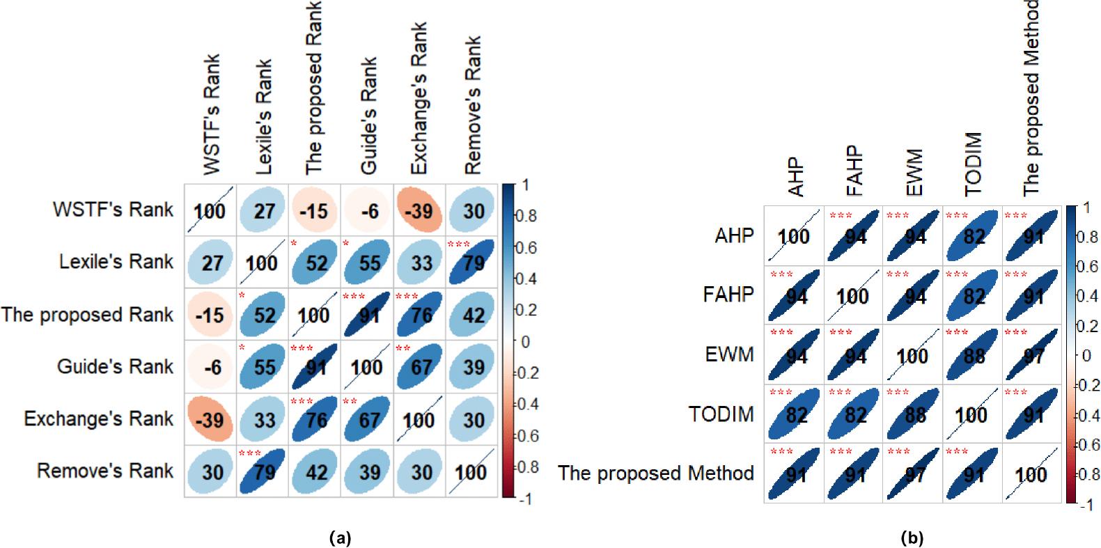 We conducted both internal (within-method) and cross-method comparisons to assess the feasibility, applicability, and robustness of the proposed decision-making framework. The internal comparison evaluates the impact of including reading experience factors and compares expert evaluations with student evaluations. The cross-method analysis compares the rankings generated by our framework with those produced by individual state-of-the-art multi-attribute decisionmaking methods.