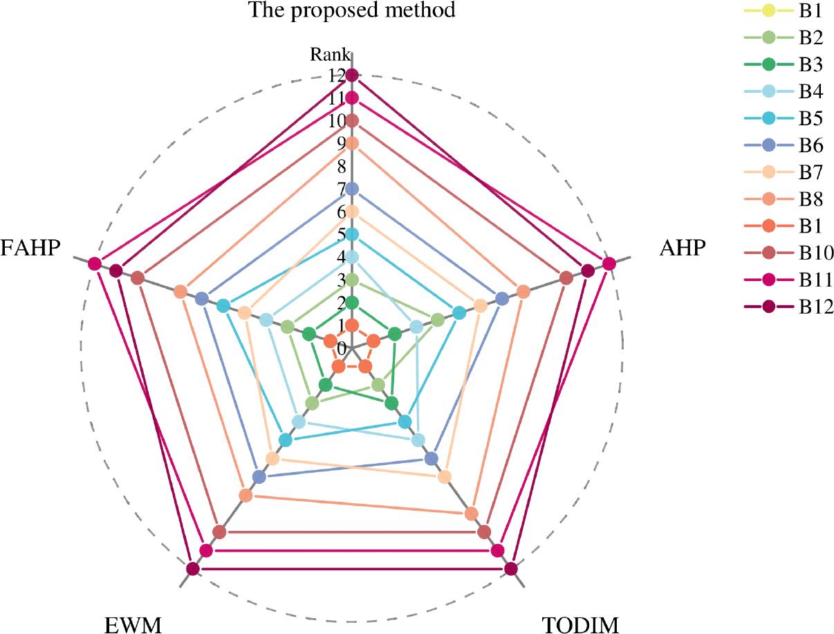 Figure 4(b) indicates a significant positive correlation among the rankings from the five decision methods, suggesting minimal differences between them. Averaging the rankings from each method yields the optimal ranking B1 > B3 > B2 > B4 > B5 > B7 > B6 > B9 > B8 > B10 > B11 > B12. This consistency with the rankings from our method proves the effectiveness and reliability of the AHP-entropy weight-TODIM method. The AHP and FAHP methods determine alternative priorities by comparing the importance of different factors, with FAHP incorporating fuzzy logic for more flexible evaluations. The higher correlation observed with the entropy weight method and TODIM is due to entropy’s data-driven weight distribution and TODIM’s consideration of psychological preferences. Discrepancies between our method and the others are minor, particularly for alternatives with similar rankings (e.g. B4 vs. B5, B8 vs. B9) due to their close overall dominance values. Our method, combining the strengths of FAHP, entropy weight, and TODIM, provides a more stable and accurate ranking of books, making it well-suited for complex decisionmaking environments.