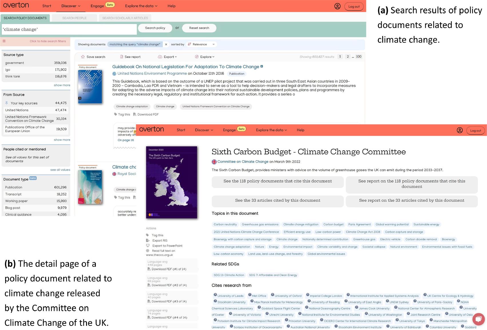 Screenshots of the Overton web interface: (a) an example of search results and (b) a detail page of a specific policy document.