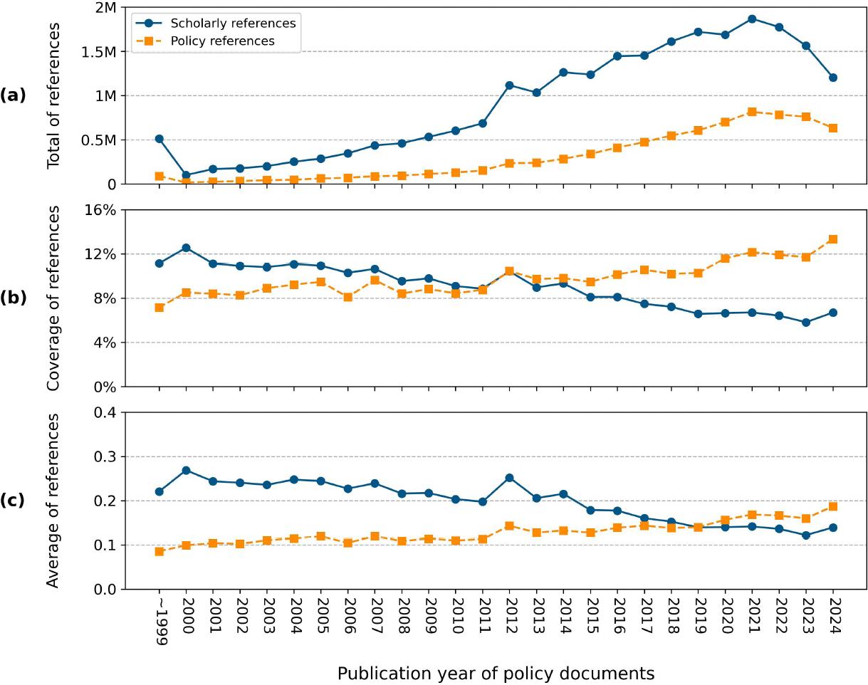 Presence of references in policy documents over publication years, presented through three perspectives: (a) total, (b) coverage, and (c) average.