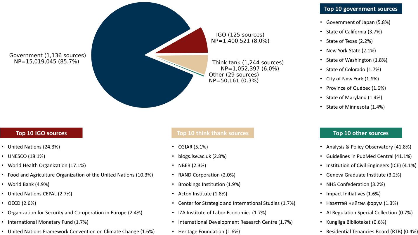 Within our dataset, Overton tracks policy documents from 2,534 distinct sources, categorized into four main types: “government”, “think tank”, “IGO”, and “other” sources such as open repositories or NGOs. Figure 3 illustrates the composition of Overton-indexed policy documents based on these source types, along with the top 10 individual sources within each category contributing the highest number of documents. Among these sources, 1,136 are governments, whose policy documents account for 85.7% of the total indexed by Overton. This is followed by IGO sources, totaling 125, which contribute 8.0% to the overall database. Think tanks, represented by 1,244 sources, contribute 6.0% of the policy documents. The remaining 0.3% originate from other sources, primarily repositories such as the Analysis & Policy Observatory and the Guidelines in PubMed Central.③