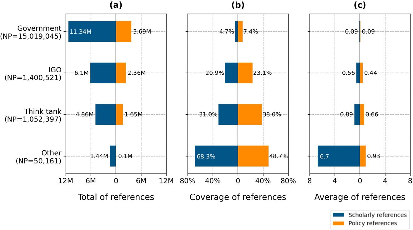 We found that policy documents from governments contribute the most to the overall reference data in Overton, largely due to the high volume of documents from this source type, followed by those from IGOs. This observation is consistent with the findings of Cristofoletti et al. (2023), who noted that governments and IGOs were the main contributors to policy citations of research funded by the São Paulo Research Foundation (FAPESP). However, in terms of the coverage and average of reference data, governmental documents cite fewer science or policy sources compared to other policy sources (i.e., think tanks, IGOs, and open repositories or NGOs). This suggests that these other organizations may place a greater emphasis on incorporating academic research into their policy documents, while government-sourced policy documents are less likely to cite academic research.