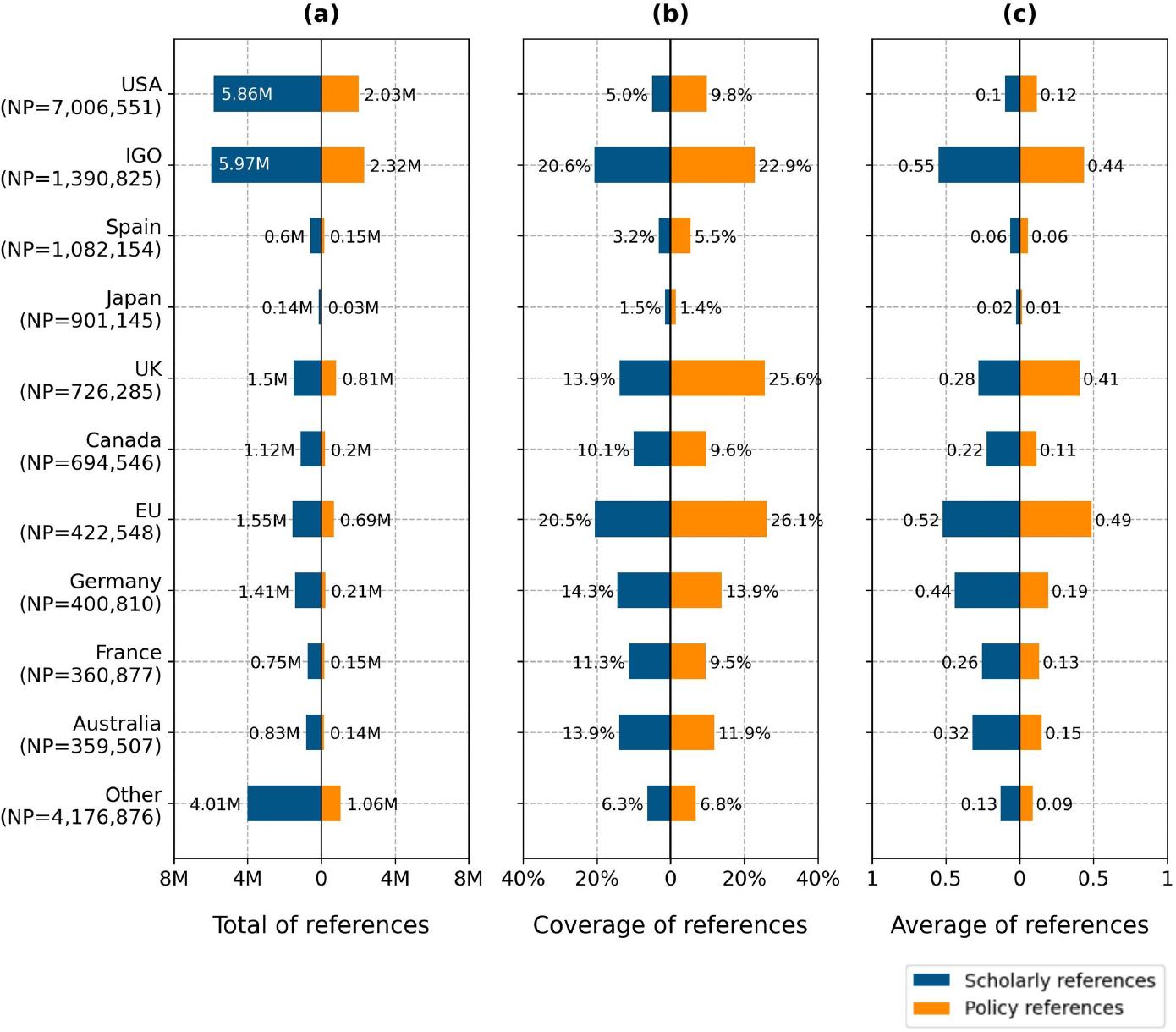 In terms of coverage and average, IGO and the EU show broader representation, with their policy documents containing more intensive references among the top countries. The US, despite accounting for 40.0% of Overton-indexed policy documents and contributing the highest total number of references, has a relatively moderate proportion of documents containing scholarly references (5.0%) and policy references (9.8%).