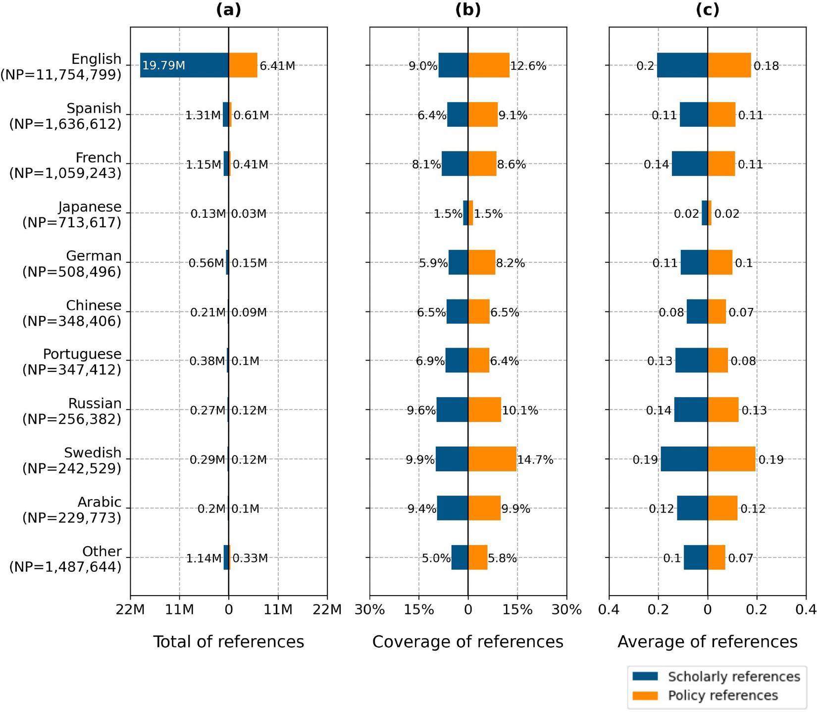 Presence of references in policy documents across the top 10 most used languages, presented through three perspectives: (a) total, (b) coverage, and (c) average.