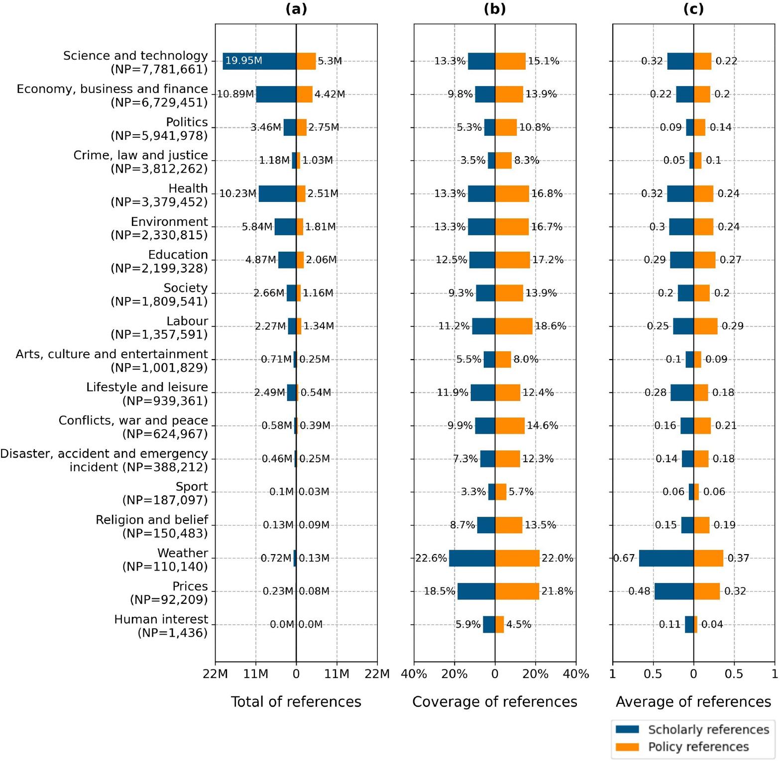 Presence of references in policy documents across subject areas, presented through three perspectives: (a) total, (b) coverage, and (c) average.