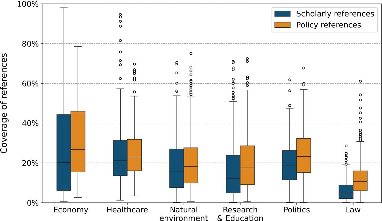Coverage denotes the percentage of policy documents containing at least one scholarly or policy reference. This indicator represents the breadth of the presence of scholarly or policy references across the dataset.