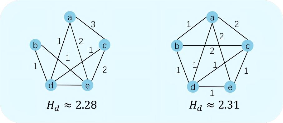 Currently, information entropy has been widely applied in various research fields, such as machine learning (Wimmer et al., 2023), coding (Li et al., 2024), and data analysis (Guo et al., 2022), due to its efficiency in measuring the complexity of various objects. In particular, its application in network science, such as in quantifying the complexity of network topology, has received significant attention (Omar & Plapper, 2020). The classical network structural entropy is often defined using global graph invariants, such as node count, edge count, or degree distribution (Dehmer & Mowshowitz, 2011). These different definitions reflect the complexity and orderliness of network structure from various perspectives. Now, network structural entropy has been widely applied in numerous research fields, including financial markets (Almog & Shmueli, 2019), privacy protection (Tian et al., 2022), and identifying breakthrough topics (Xu et al., 2022).