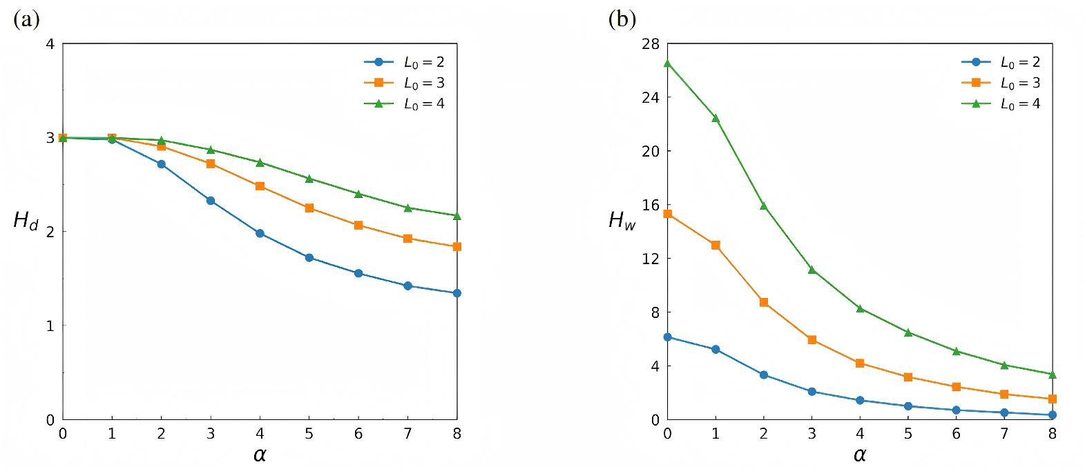 Degree entropy (Hd) and edge-weighted entropy (Hw) under different distribution parameters (α) with L0=2,3 and 4 respectively, where n=20, m=1,000. The results are averaged over 100 independent trials.
