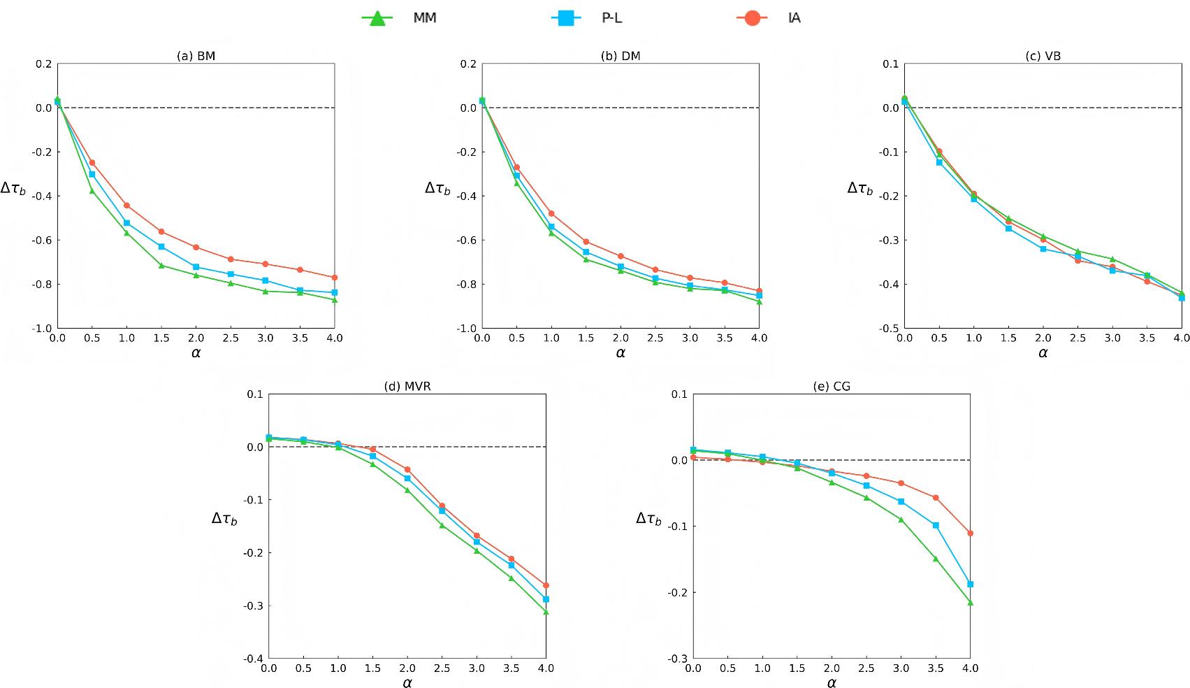 The relative change in Kendall’s tau-b (∆τb) under different distribution parameters (α), where n=50, mb = 1,000, mc = 2,000 and L0 = 10. Different colors represent different data generation models, e.g. green color denotes the MM. The results are averaged over 100 independent trials.