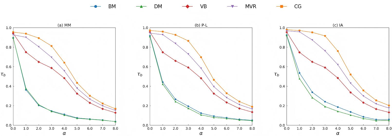 The Kendall’s tau-b (τb) under different distribution parameters (α), where n = 50, m = 1,000, and L0 = 10. The results are averaged over 100 independent trials.