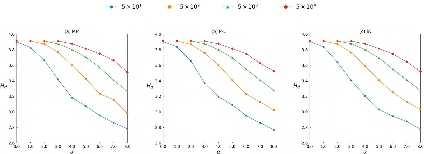 Degree entropy (Hd) under different distribution parameters (α) and numbers of rankings (m), where n = 50 and L0 = 10. The results are averaged over 100 independent trials.