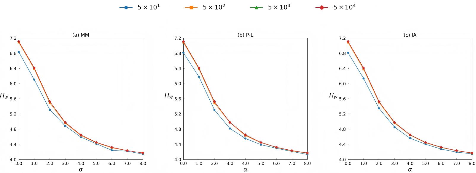 To validate the performance of the three extended models in generating ranking data with varying distribution characteristics, we generate ranking data for varying α and compute the corresponding degree entropy Hd and edge-weighted entropy Hw. Since all three models employ the same method to control the distribution characteristics of the ranking data, we use the MM model as an example for the experiments. We set n = 20, m = 1,000, and the length of rankings L0 = 2,3,4. The experimental results are shown in Figure 5. It can be observed that as the value of α increases, both entropies gradually decrease, indicating that the distribution of input ranking information among objects becomes increasingly concentrated.