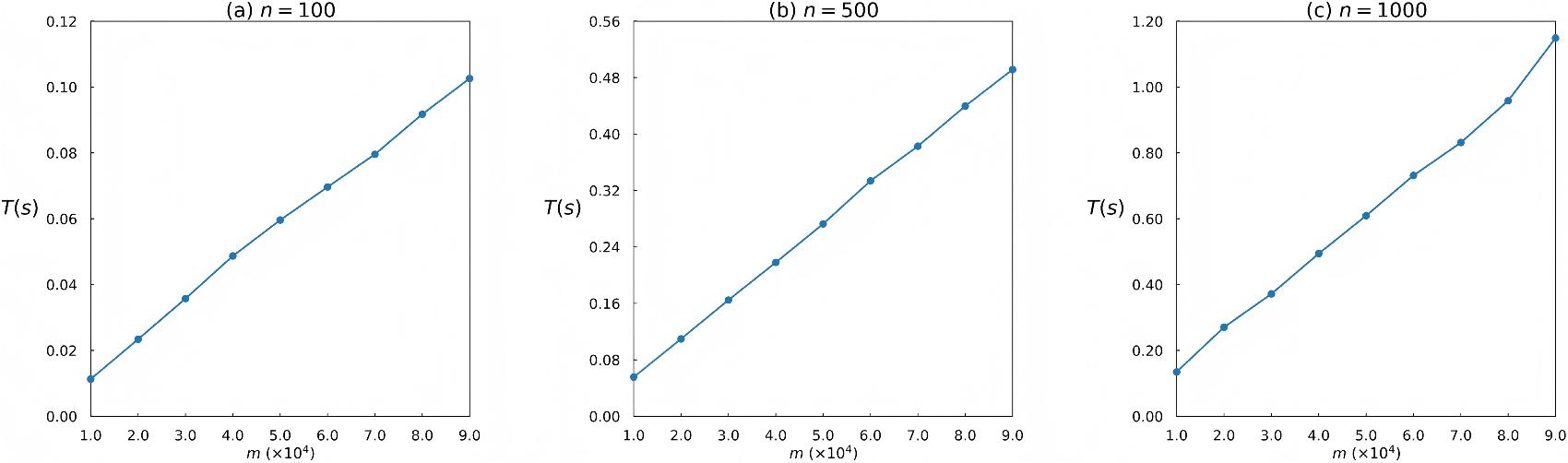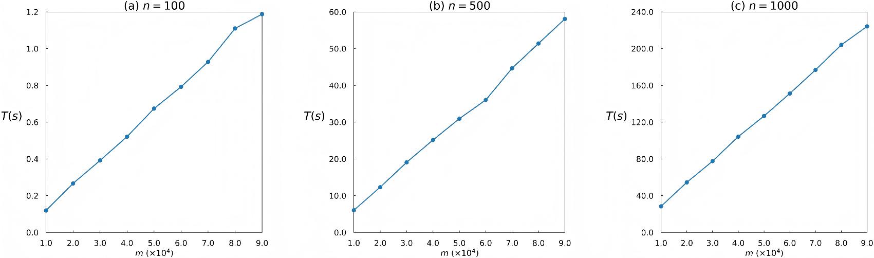 As shown in Figure 10 and Figure 11, when the number of ranking objects reaches 1,000 and the number of rankings reaches 9×104, both entropy-based methods can complete the computations within a short time, indicating that they maintain high computational efficiency in large-scale ranking scenarios. Among them, degree entropy performs better than edge-weighted entropy. In addition, when n is fixed, the computational time of both methods increases approximately linearly with m, further demonstrating that they can remain efficient even when processing a larger number of rankings.