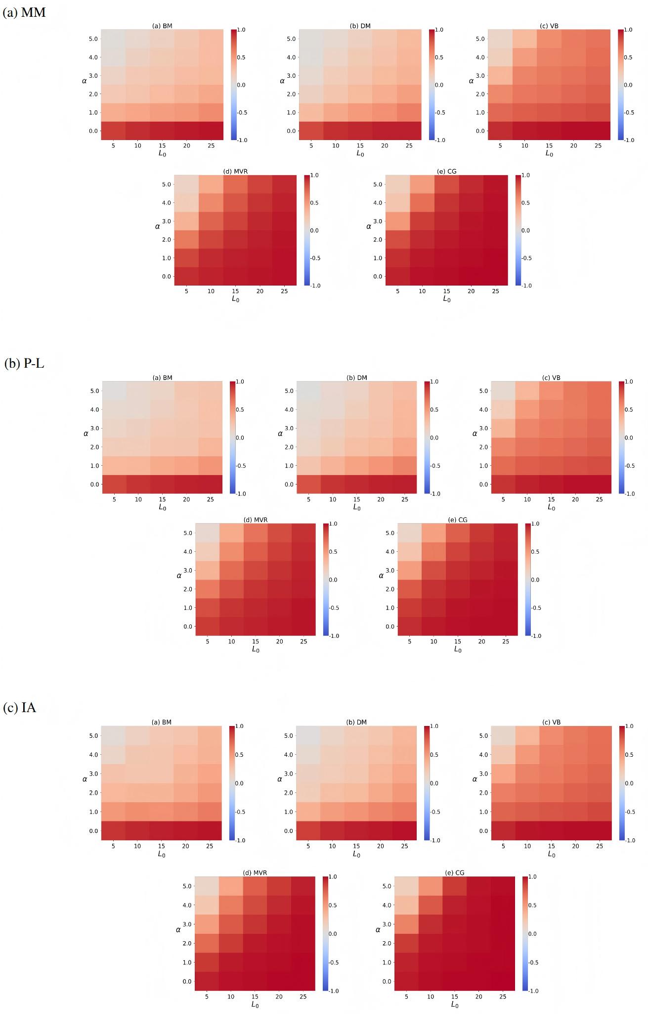 For the data generated by the three models, it can be observed that as the value of α increases, an increase in the input ranking length L0 causes the red cells to gradually deepen. This indicates that increasing the ranking length L0 can mitigate the decline in aggregation effectiveness caused by the unequal probability of each object being selected for ranking. In particular, the MVR and CG methods outperform the other three methods in significantly improving aggregation effectiveness as the ranking length L0 increases. This is because both methods leverage pairwise comparison information between objects. As the ranking length L0 increases, more node pairs become connected in the network. Even if these edges have low weights, MVR and CG can still effectively utilize the available comparison information to enhance aggregation performance.