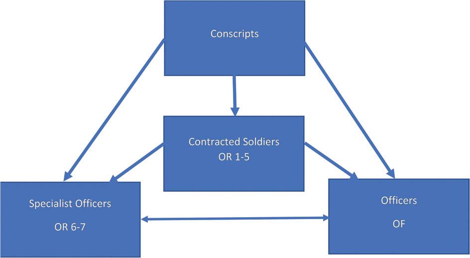 As emphasised above, there is a need to secure the inflow from the conscript and contracted soldier categories (OR 1–5) to military careers as tactic or SOs. Most emphasis is currently on recruitment, but outflows from the military is equally important to take into consideration.