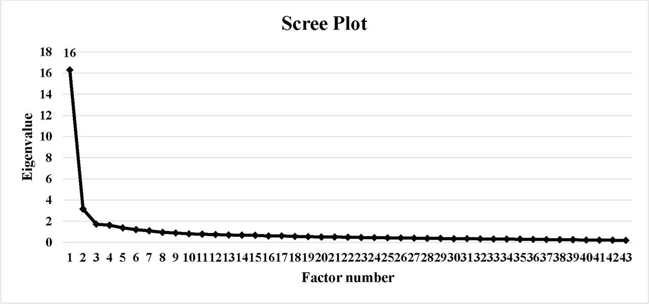 The process began with 55 items on the OR scale. After several runs and deletion of items with similar meaning and high correlations, the analysis resulted in 43 items remaining in the questionnaire, yielding six factors with eigenvalues between 1.2 and 16.3. The scree test, as shown in Figure 2, shows six points remaining above the flattened line of the eigenvalues.