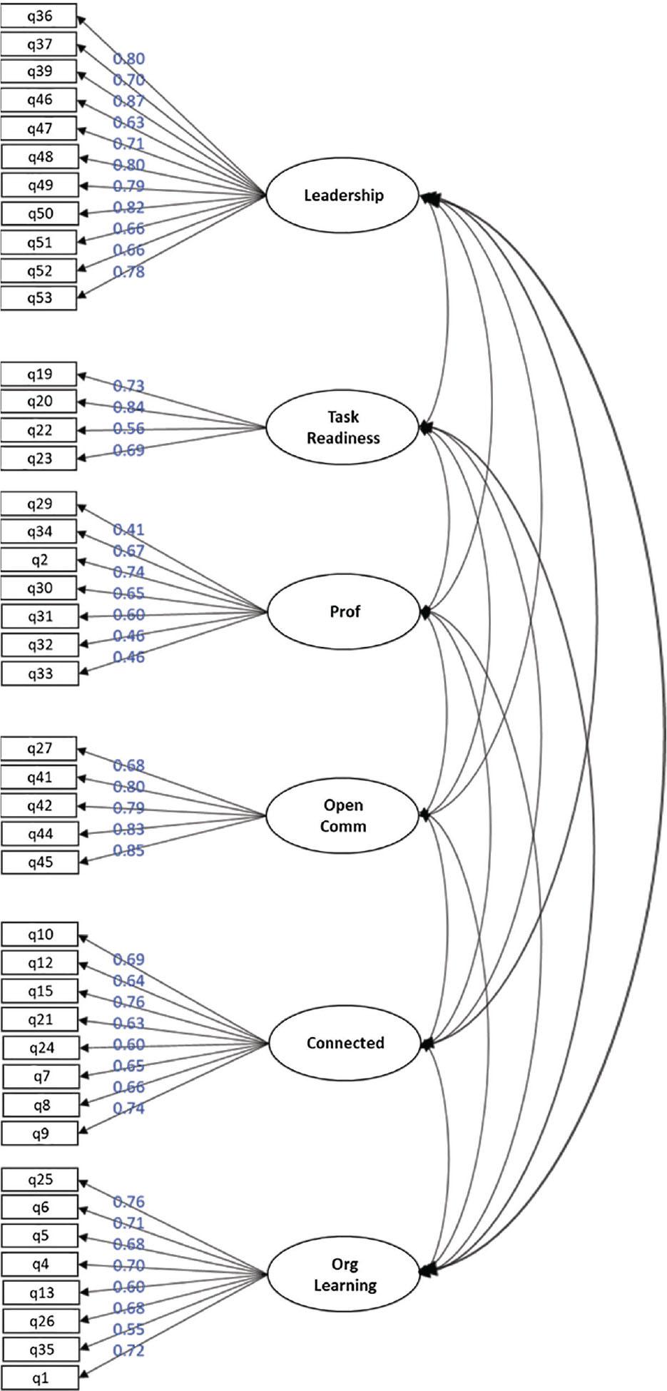 The following factor structure was first composed of these six factors: leadership, professionalism, task readiness, open communication, organisational learning and connectedness. Appendix 1 provides a summary of the final EFA (which is in fact the final 6FORT questionnaire, since no additional changes were made in the validation study).