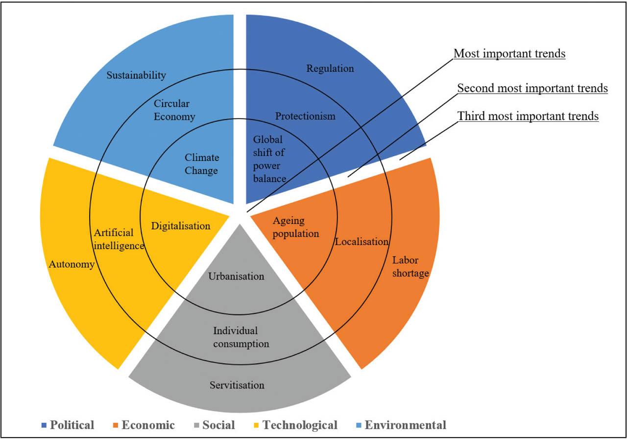 | Global shift in power balance, protectionism, global trade shift, polarisation | Demographic changes, localisation, labour shortage, increasing inequality | Urbanisation, individual consumption, increasing inequality, servitisation | Digitalisation, artificial intelligence, Industry 4.0, cyber-physical systems, blockchain technology | Climate change, resource scarcity, circular economy, sustainability, zero emissions, natural disasters |