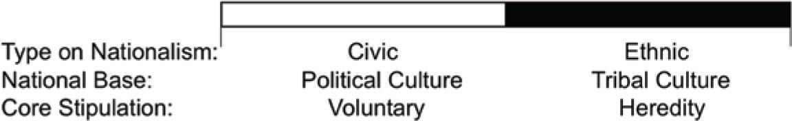 The geographic separation absorbed most of the criticism. In a study of 15 countries, it was argued that “the traditional civic-West/ethnic-East argument is a gross simplification of concepts of nationhood in the West, Central Europe, and Eastern Europe” (Shulman 2002, 582–3). In an attempt to defend its advantages, it was even argued that Kohn himself did not believe in his dichotomy but rather intended to normatively criticize both kinds of nationalism (Pianko 2010, 311). But even critics of the empirical use of the terms continued to support the principle of an existing dichotomy between a tribal-based heredity ethnic nationalism and a voluntary and progressive civic nationalism (Kuzio 2002, 36; Shulman 2002, 558). Thus, despite the criticisms, and as evident from contemporary literature on the “radical right,” the core concepts of “Kohn's dichotomy of nationalism,” presented in Figure 1, remained a common tool in the study of national identity.