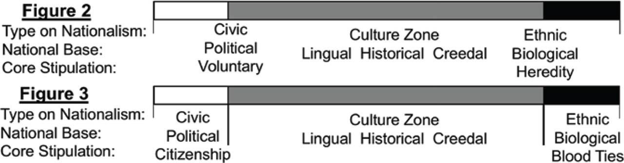 As shown in Figure 4, the lingual, historical, and religious bases express a gradual aspiration for cultural homogeneity. But as they can be purchased, they are more flexible than ethnic nationalism. Nationalism based on the linguistic group requires learning the language. History-based nationalism may add a behavioral requirement in the public sphere, preferencing the traditional customs of the national group over practices that contradict them. Religious nationalism is the closest to ethnic nationalism because it requires not only years of learning the language and local customs but also at least partial commitment to a certain creed.