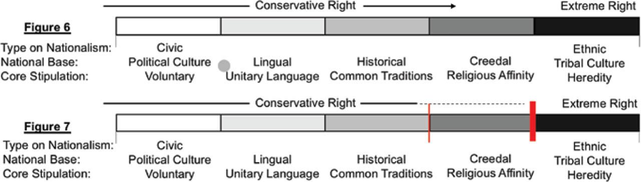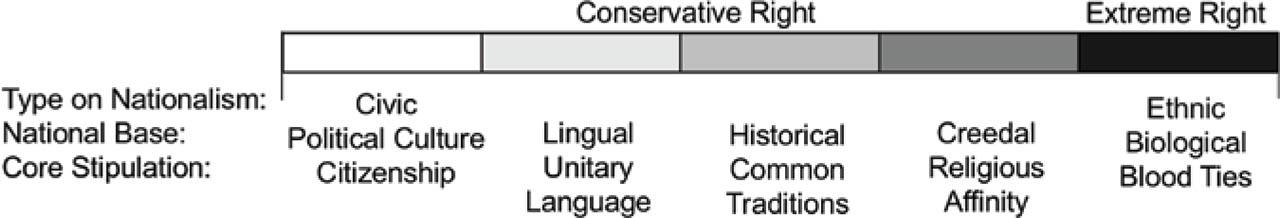 The conservative ideology thus contains both civil and cultural national factors, which are expressed as a base for group identity and are dominant in the public sphere. If Scruton's position is representative of contemporary conservatism, then the preservation of national language, protection of traditional civil customs, respect for the nation's religious heritage, and concern about a multicultural reality are examples of national policy identified with the conservative right. The reasonable possibility that far-right groups will also support these proposals does not make them radical, racist, or fascist in and of themselves. It may actually indicate that those radicals are actually quite conservative.