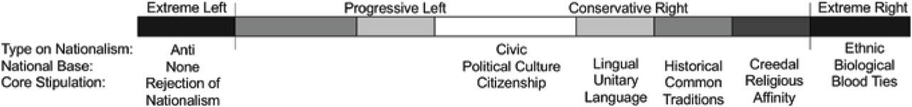 This signals the importance of a theoretical expansion that would delineate the area that lies between those “ethnic” and “civic” types on nationalism, an area dominated by adherence to cultural bases of national identity. This article will suggest that turning Kohn's “Dichotomy of Nationalism” into an axis of national ideologies would create a much more sensible base to understand the national attitudes of the right that can be further expended to correlate the entire political spectrum. As an axis is more sensitive to nuance than a dichotomy, it would avoid conflating conservative and reactionary policy proposals. This would also prevent an unintentional inflation of the far-right and indicate the responsibility of mainstream right-wing parties to separate themselves from a kind of nationalism that goes against the civic foundations of twenty-first-century democracy.