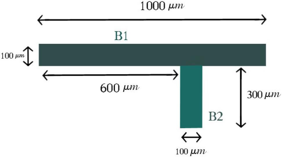 For Figure 1, the depth, width and height of the long channel created are 100 μm, 1000 μm, 100 μm, respectively, while the width, length and height for the shorter channel are 300 μm, 100 μm, 100 μm, respectively. Similarly, for second design in Figure 2, the top and middle channel has the depth, width and height of 500 μm, 100 μm, 100 μm, respectively and the bottom cavity has dimensions of 100 μm width, 100 μm depth and 25 μm height.