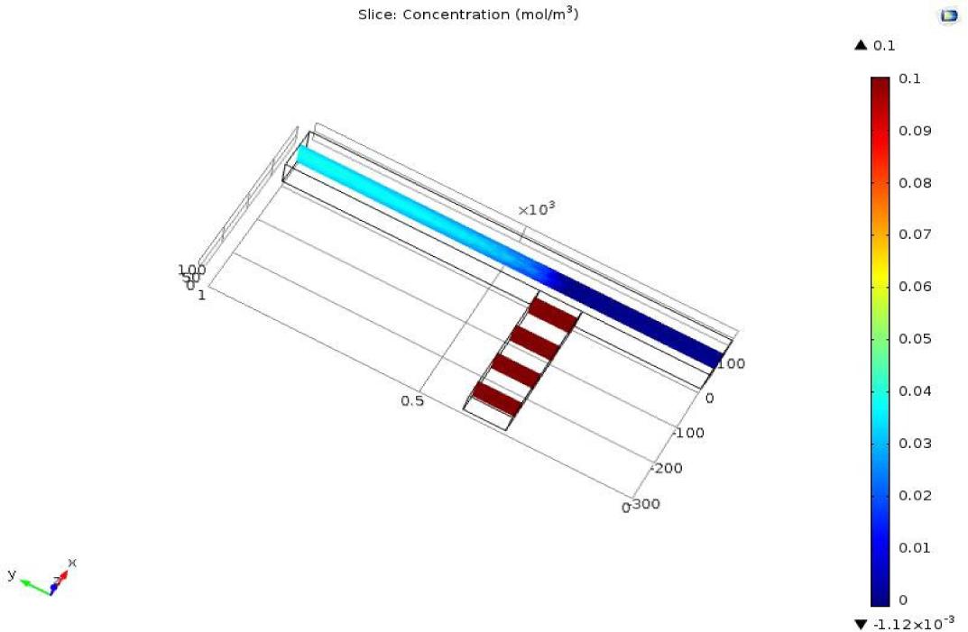 In this section, the second design and its simulation results for the multilayered device is discussed. The dimensions were already discussed in earlier sections. Below are the results of the concentration profile, contour pressure and fluid velocity as shown in figures 10, 11 and 12.