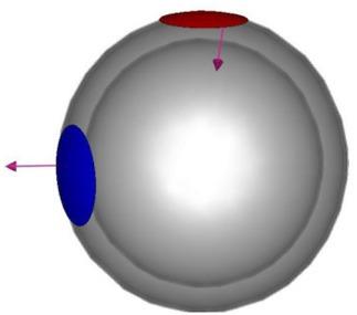 A commercial software package (CST EM STUDIO® (CST EMS)) was used to design electrodes and to model a layered human head model. The circular electrodes were designed with electric properties of perfect conductors of 0.01 cm thickness and 7.068 cm2 area, situated at sites commonly used in the tDCS on M1 and FP2. Figures 2 and 3 show the geometry of the electrodes, the current direction, and the model layers, respectively. The real head model consists of different layers.