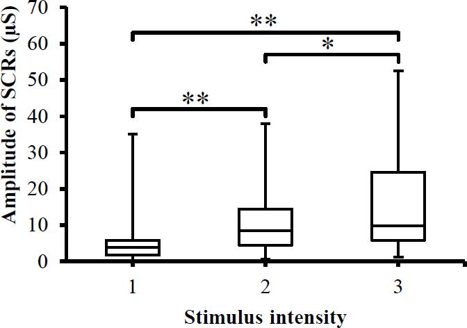 Box-plot with medians, quartiles and the min and max as whiskers shows value of SCRs_Amp with respect to the stimulus intensity. *p<0.05 and **p<0.005.