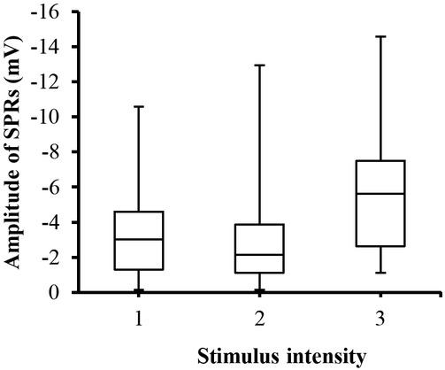 Box-plot with medians, quartiles and the min and max as whiskers shows value of SPRs_Amp with respect to the stimulus intensity.