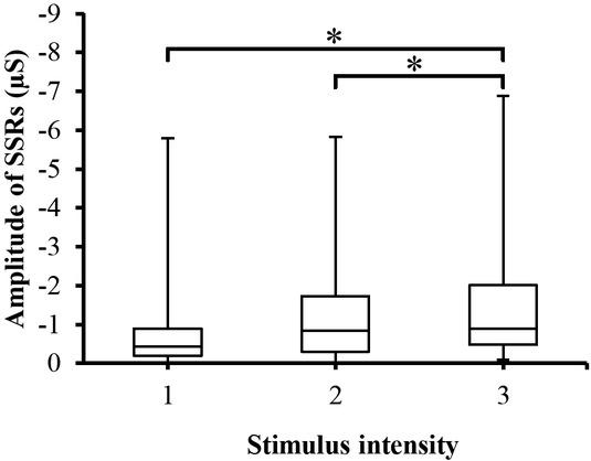 Box-plot with medians, quartiles and the min and max as whiskers shows value of SSRs_Amp with respect to the stimulus intensity. *p<0.05.